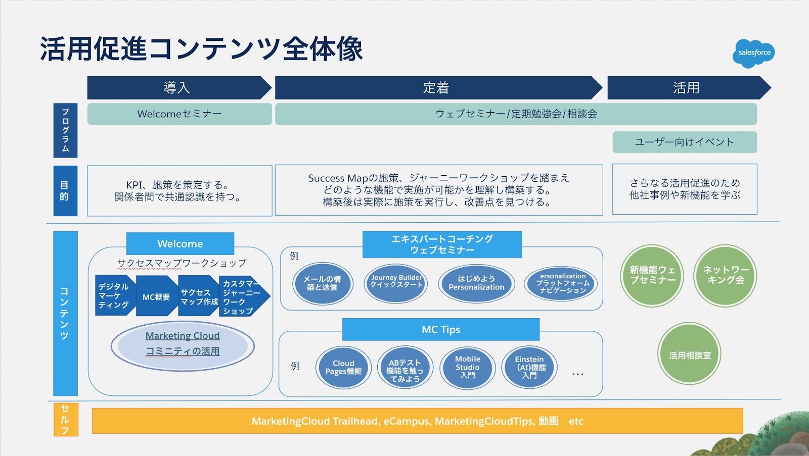 MC全体概要、Success Mapの策定、カスタマージャーニーワークショップの実施などを実施しており、契約いただいた後に一番初めに利用いただきたいコンテンツ。