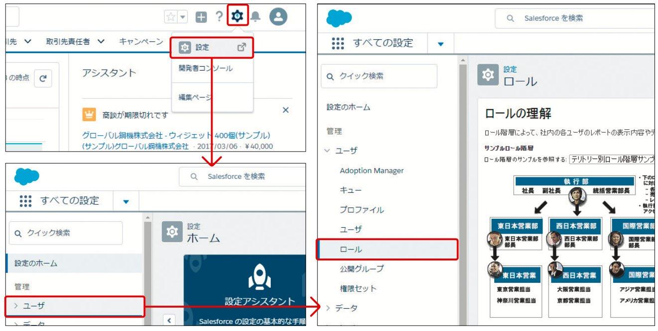 画面右上の「設定」アイコンをクリックし「設定」を選択。 左側に表示されるメニューで「管理」にある「ユーザ」を クリック。展開されたメニューで「ロール」を選択します。