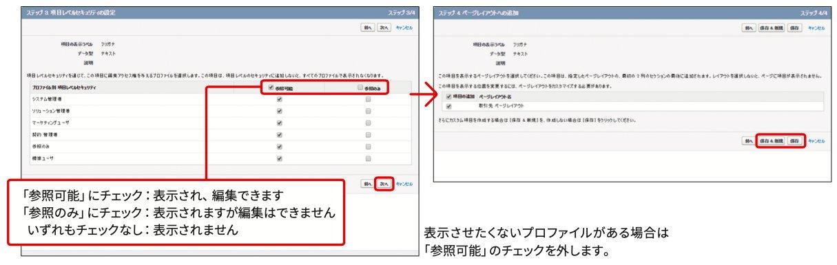 取引先や他のオブジェクトに項目を追加する上でのポイントは以下の通りです;