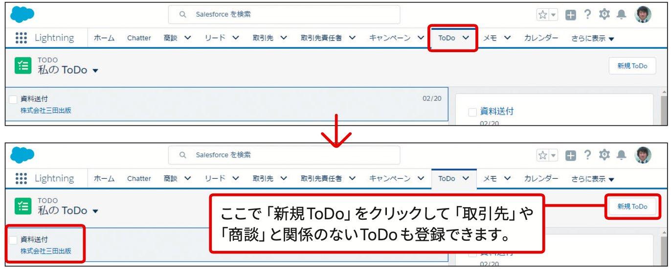 たとえば、取引先に資料を送付することになった場合、その取引先のページまたは商談のページを開いて「新規 ToDo」をクリック。件名や期日を入力して最後に「保存」を押します。