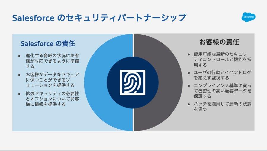 この視点を、Salesforce が責任を持って提供すべきものと、お客様が責任を持って確認・判断・実行すべきもの、で表現したのが「Salesforceのセキュリティパートナーシップ」です。