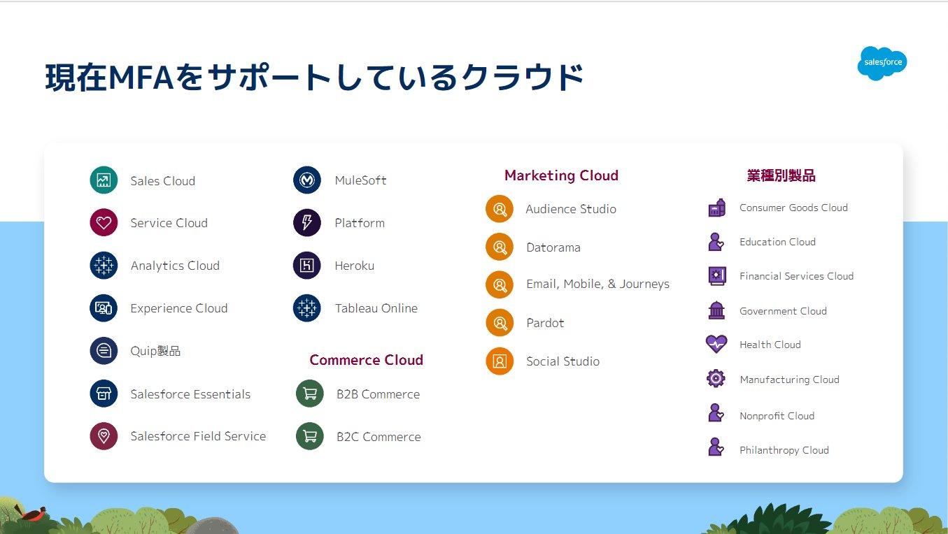 多要素認証やセキュリティ強化の対象となった機能については、各製品のリリースノートやヘルプ記事などを通じてその機能概要の説明や設定方法をご案内しておりますが、特に注力している多要素認証の概要や設定になどに関する情報はウェブセミナーや Trailblazer Community などを通じて英語だけでなく日本語でのガイダンス資料やデモ動画を提供し、お客さまの理解や評価に役立つ情報発信に努めています。参考リソースをご参照いただきご活用いただければと思います。