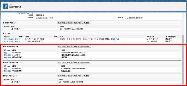 アクション種別で[レコードを編集するためにロックする]に設定することで、承認申請中は申請内容をユーザによって変更されることを防ぐことができます。
