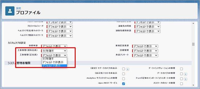 正社員の場合、契約社員用の工数管理オブジェクトを使用することはないですし、間違えて使用しないためにも「タブを隠す」に設定します。
