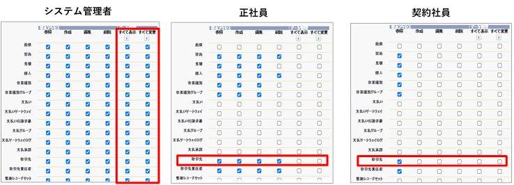 システム管理者はすべての権限がありますが、正社員と契約社員はどうでしょうか。