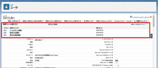 契約社員Aさんのユーザ設定ページを見てみると、複数の権限セットが割り当てられていることがわかります。