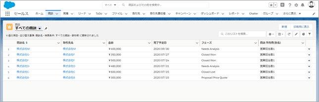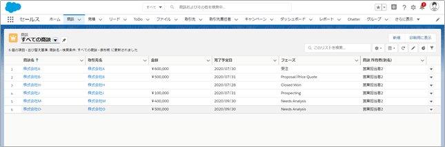 営業担当のユーザに代理ログインして商談レコードを確認してみますと、商談オブジェクトの組織の共有設定が[公開/参照・更新可能]の時はすべてのレコードが見えています。