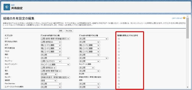 ※[階層を使用したアクセスを許可]の編集はカスタムオブジェクトのみ編集可能。