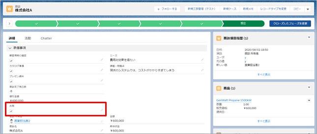 株式会社Aの商談レコードの共有項目にチェックを入れます。