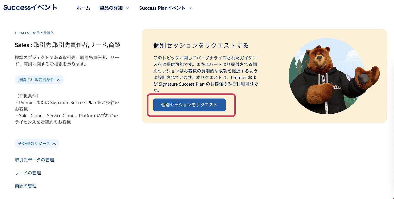4.“推奨される前提条件“ 等をご確認いただき、問題なければ[個別セッションをリクエスト]をクリック