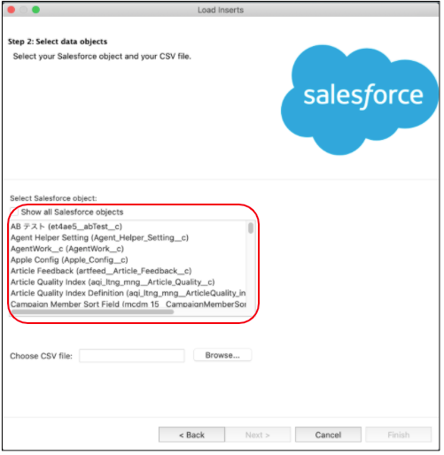 表示されていない場合は「Show all Salesforceobjects」にチェックを入れオブジェクトを全て表示させてみてください。