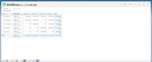 レポートを実行すると、このようにフェーズごとの金額と、合計金額に対する各フェーズの割合を表示することができました。