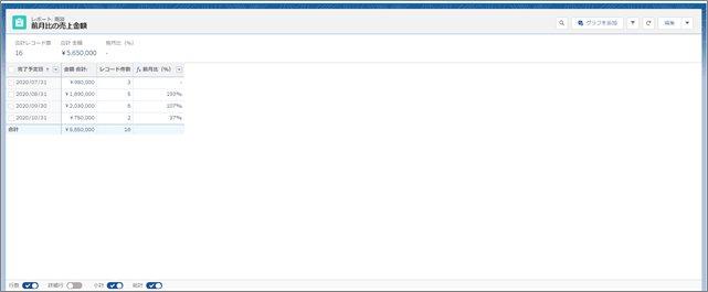 レポートを実行すると、月ごとの金額と、前月差異という形で前月の売上金額との割合を表示することができました。