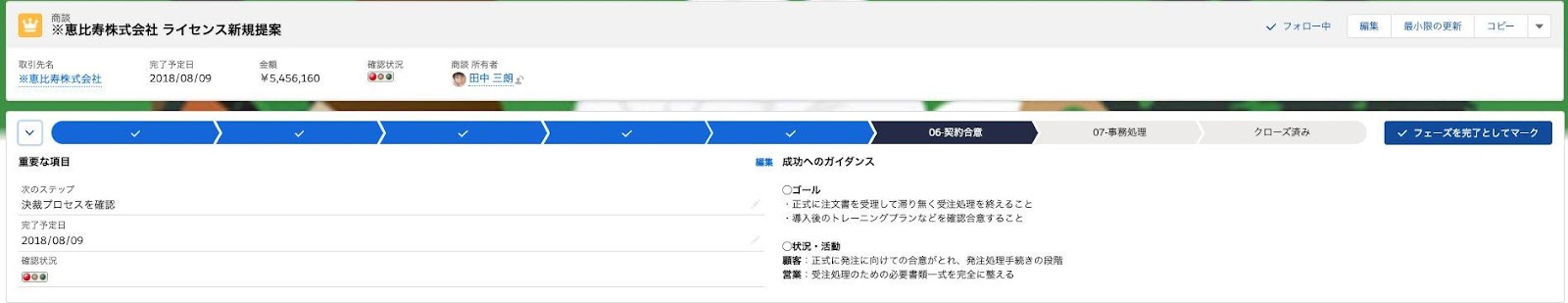 重要な項目や、成功へのガイダンスを設定することで、セールス機会を獲得する営業担当者へのフォローアップにつながります。