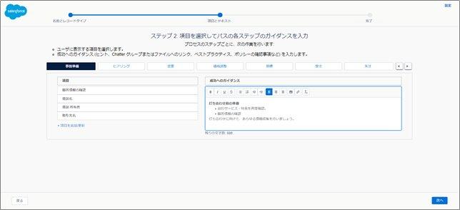 パスは選択リスト値が存在するオブジェクトに対して、レコードタイプごとに設定することができます。選択リスト値が、特定値に変更される場合に、重要な項目と成功へのガイダンスが画面に表示されるようになります。