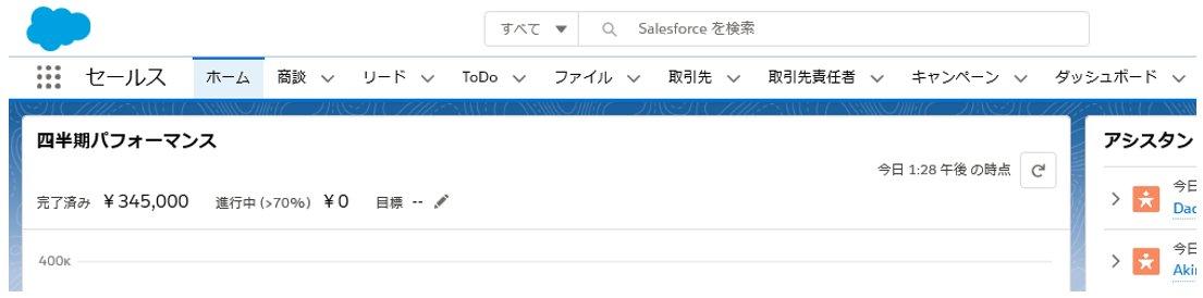 Lightning Experienceのホーム画面には、各ユーザーが1日のスケジュールを管理するために必要とする情報を表示することをお勧めします。デフォルトでは、四半期のパフォーマンスサマリーや、今日のToDoおよび商談に関する重要な最新情報を参照することができます。