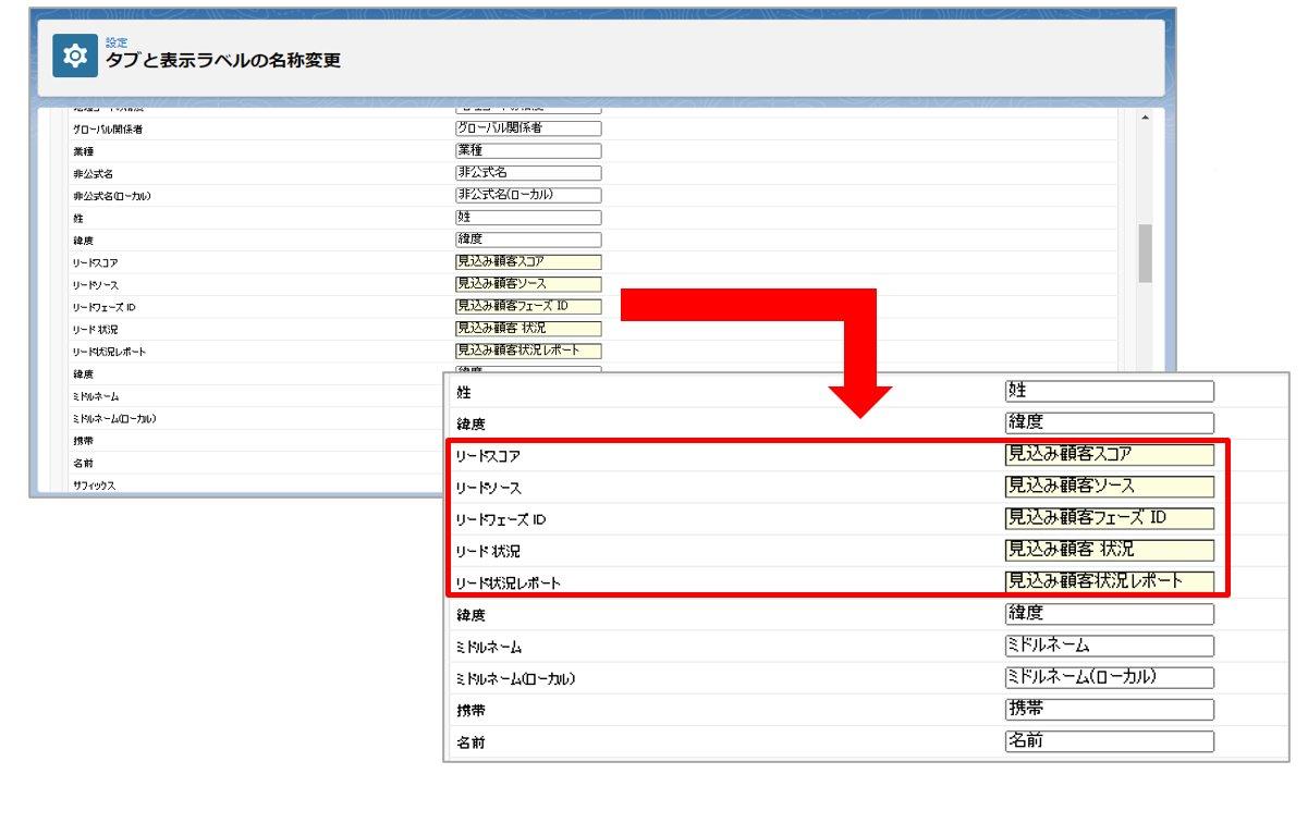 ※上図のようにタブ名を[リード]から[見込み顧客]に変更すると、一部項目の表示ラベルが連動して変更されますので、意図に沿った表示ラベルになっているか確認してください。