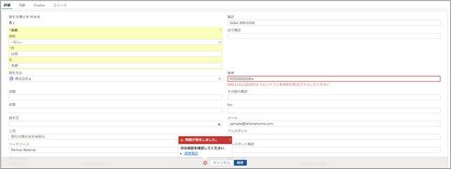 携帯番号の入力形式を指定する入力規則を設定することで、桁数が 11 桁を超えたり、ひらがなやアルファベットが含まれた番号を入力したりすると、エラーメッセージが表示され、エラーが解消するまでレコードが保存されないようになります。