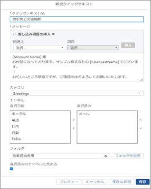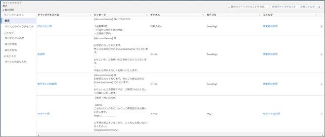 クイックテキストはメールテンプレートと少し似ている気がしますが、クイックテキストではいくつかの文章を組み合わせて構成することができ、ToDo や行動といったメール以外にも対応しているので、さまざまなシーンで活用できますね。