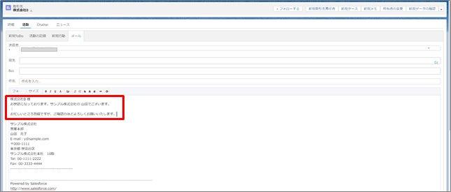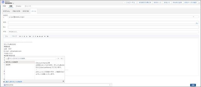 - クイックテキストの入力が完了したら、取引先のレコードページのメール入力画面で、実際にクイックテキストが作動するか確認