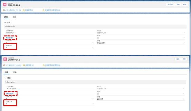 工数管理名:2020-07-22-1では実績工数が4、工数管理名:2020-07-24-1では実績工数が6なので実績工数合計は10になります。