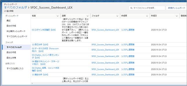 ダッシュボードには新しく「SFDC_Success_Dashboard_LEX」というフォルダが追加されています。