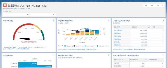 「06.商談マネジメント(マネージャ向け)【LEX】」をクリックすると、レポートとダッシュボードがすでに作成されています。これをテンプレートとして活用することで、1から作成する手間が省けますし、初心者ユーザの方でも簡単にレポートとダッシュボードを作成することができそうですね。