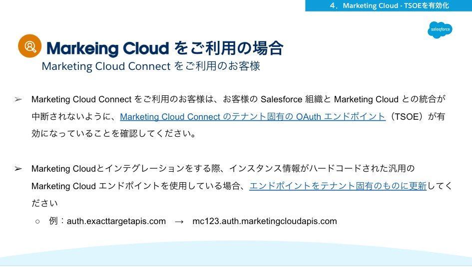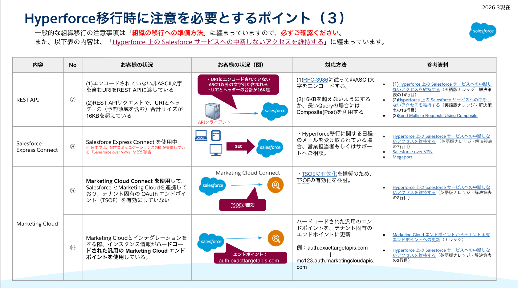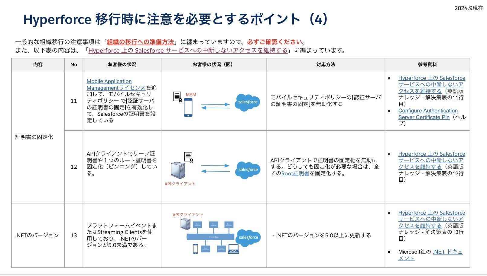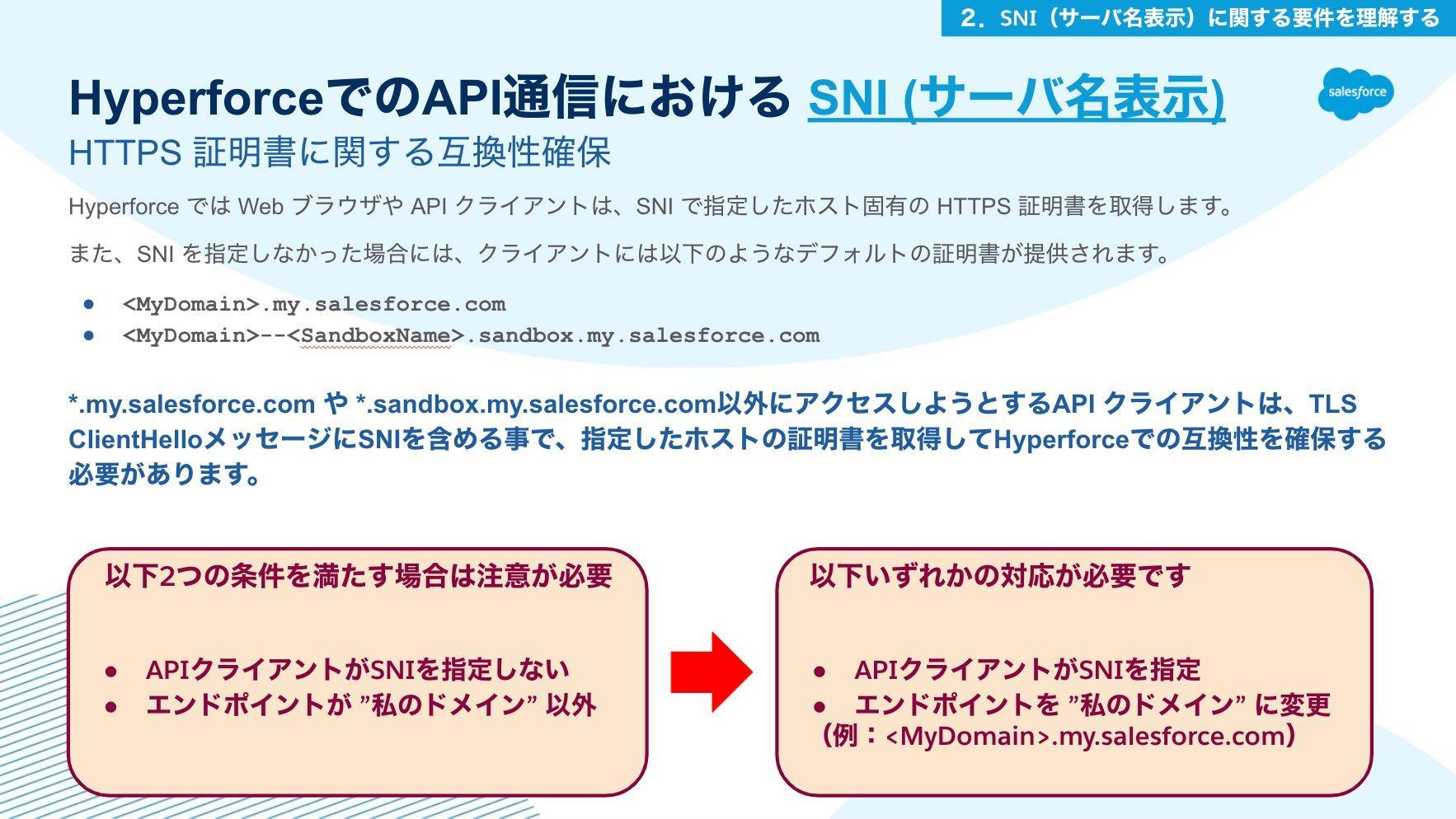 上記スライドの内容に該当している場合、Hyperforce移行後に、不都合が生じる場合がございます。