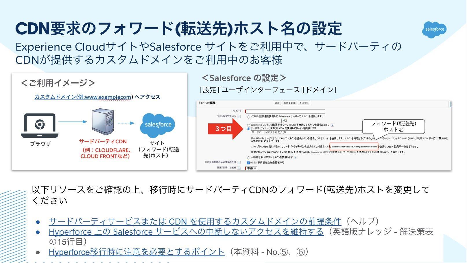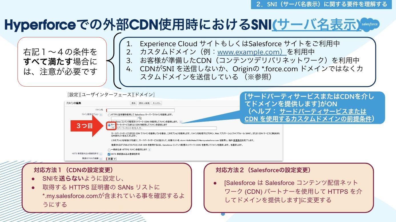 こちらはExperience CloudサイトやSalesforceサイトをご利用、かつ(www.example.comといった)カスタムドメインをSalesforce CDNではない独自CDNで提供していて、そのCDNがSNI を送信しない設定になっているか、Originの *.force.com ドメイン(※)ではなくカスタムドメインを送信している場合に必要な対応です。