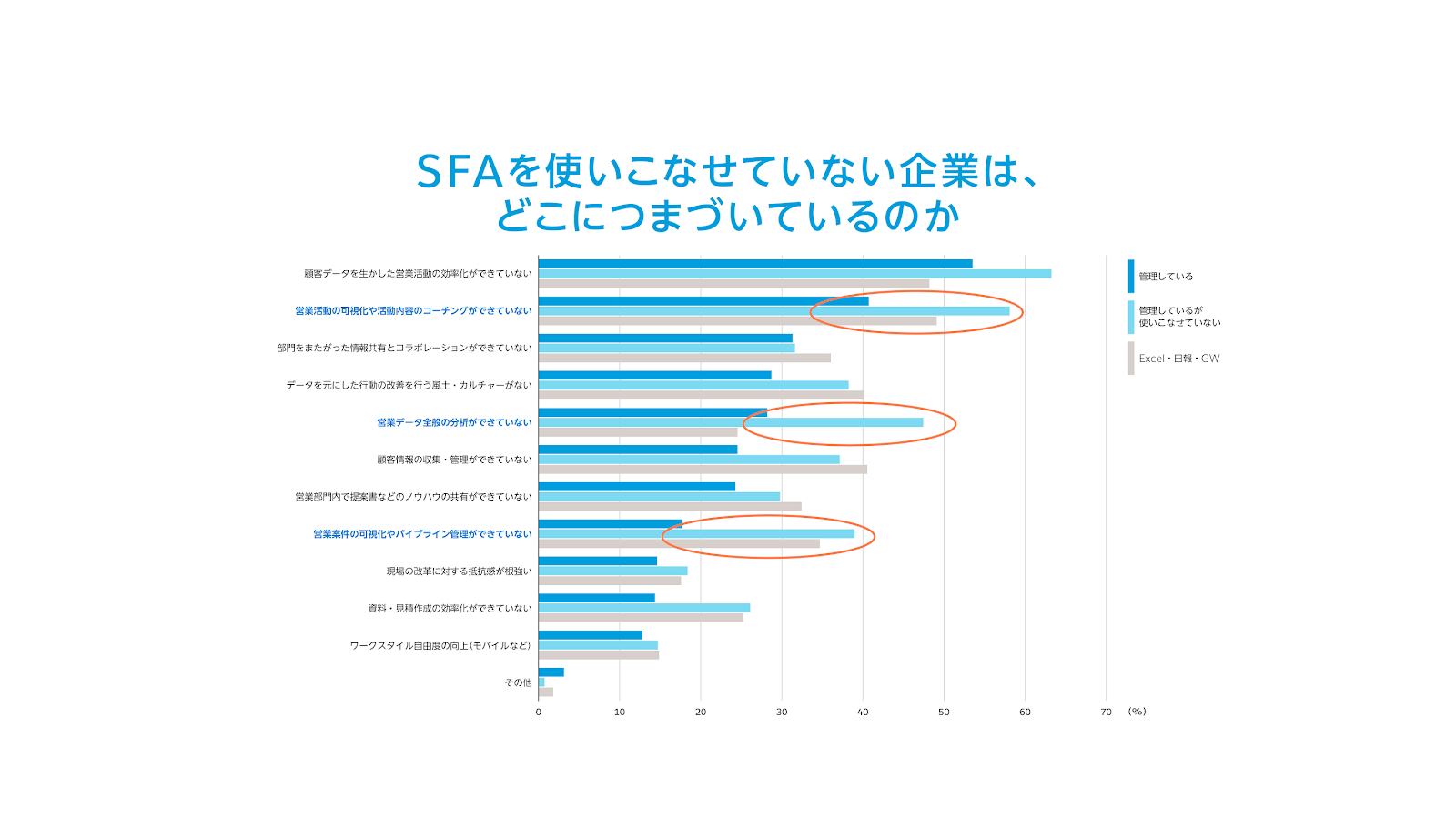 そして、「顧客データを生かした営業活動の効率化ができていない」や「営業活動の可視化や活動内容のコーチングができていない」に関しては、「管理している」と答えた企業でもまだ強く課題に感じていると思われます。
