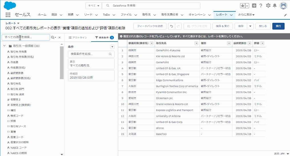すべての取引先レポートの表示列に業種項目を追加する、表示列から評価項目を削除する