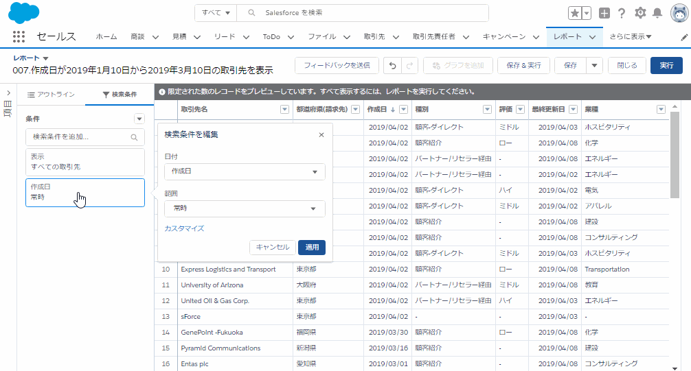 作成日が2019年1月10日から2019年3月10日の取引先を表示する