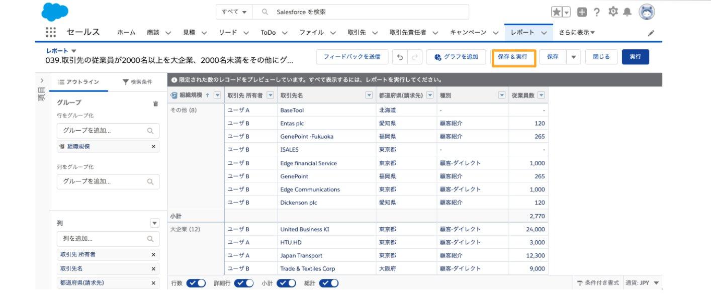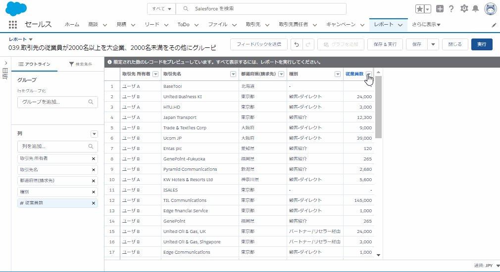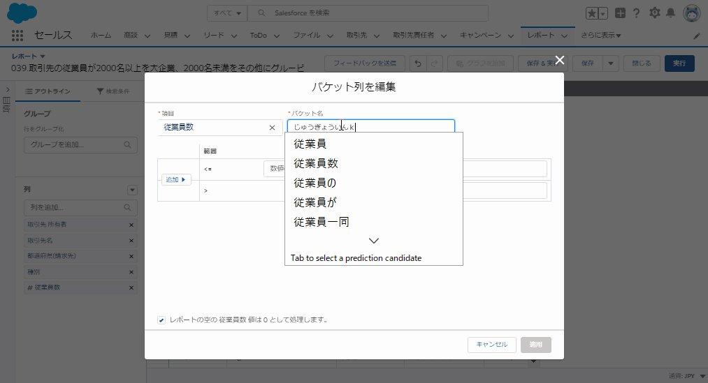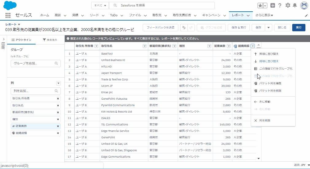 レポートプレビュー画面の[従業員数]の右側にある[▼]より、[この列をバケット化]をクリックします