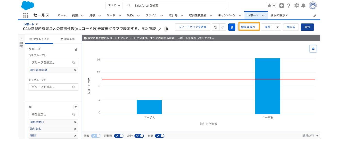 取引先所有者ごとの取引先件数(=レコード数)を縦棒グラフで表示する。また任意の値かつ赤色で基準線を表示する
