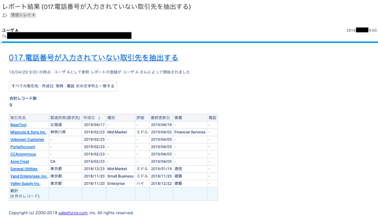 取引先所有者で取引先をグルーピングする。実行したレポートが毎週月曜日の午前9時に自分に配信されるように登録する