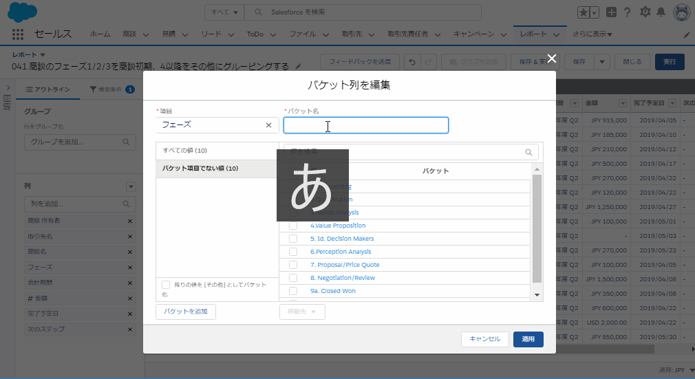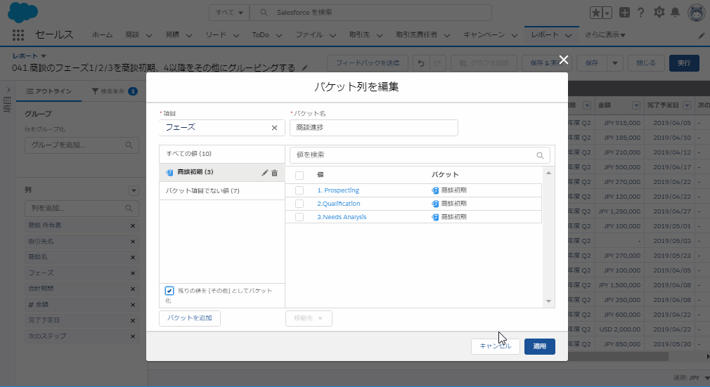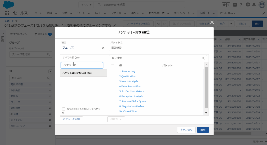 レポートプレビュー画面の[フェーズ]の右側にある[▼]より、[この列をバケット化]をクリックします
