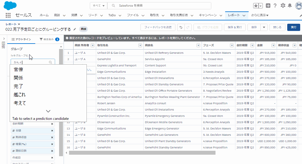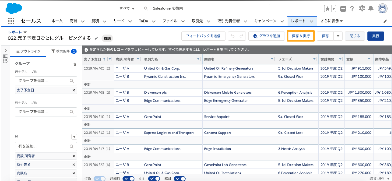 商談の完了予定日ごとにグルーピングする