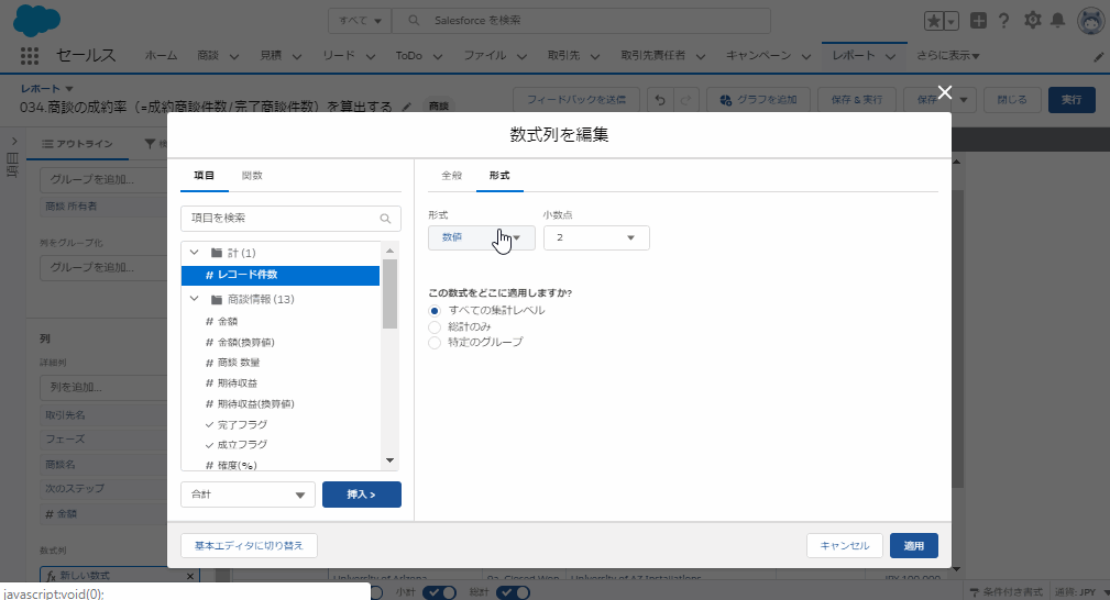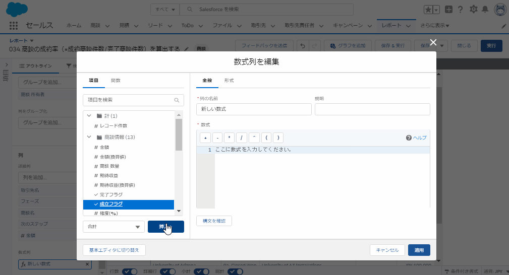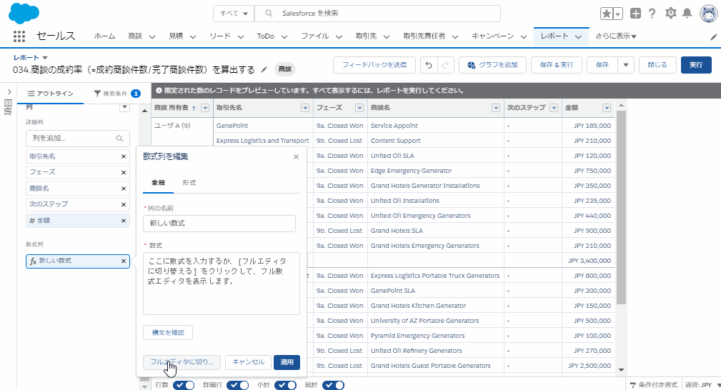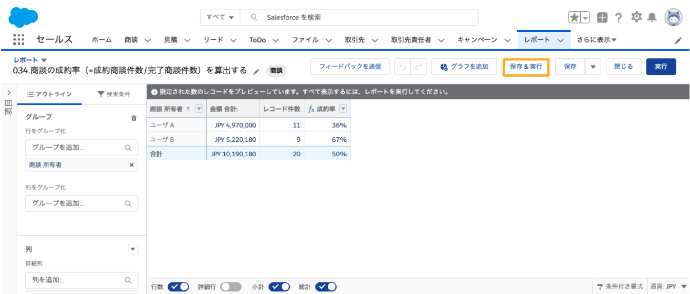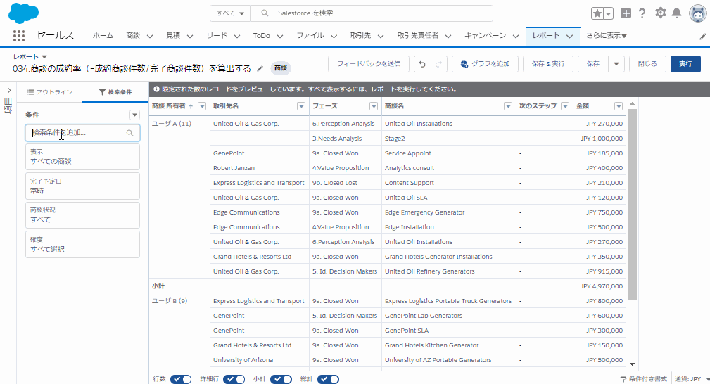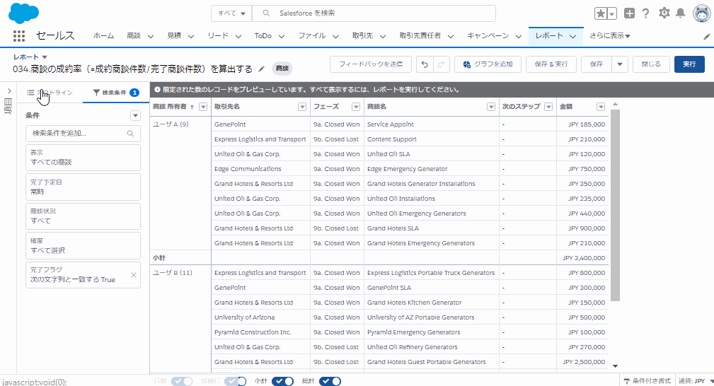【任意】詳細行を非表示とすることで、各商談所有者での成約率をみることが可能です
