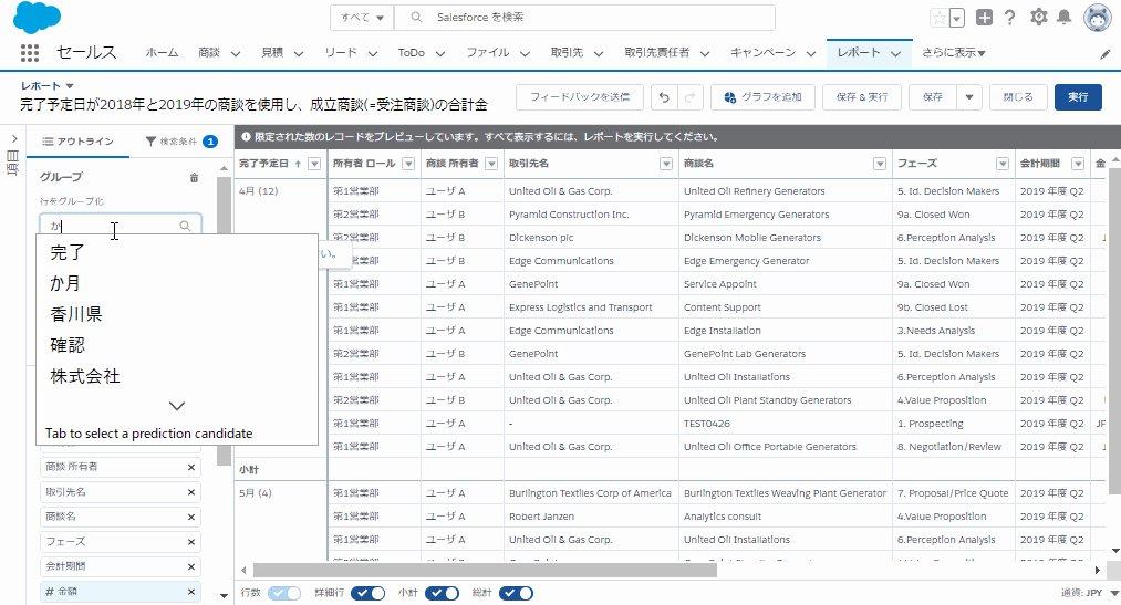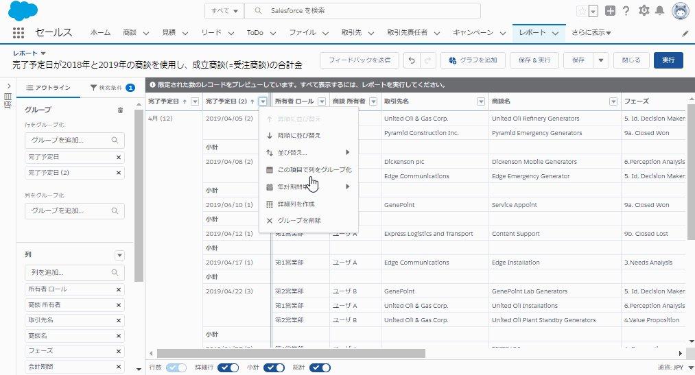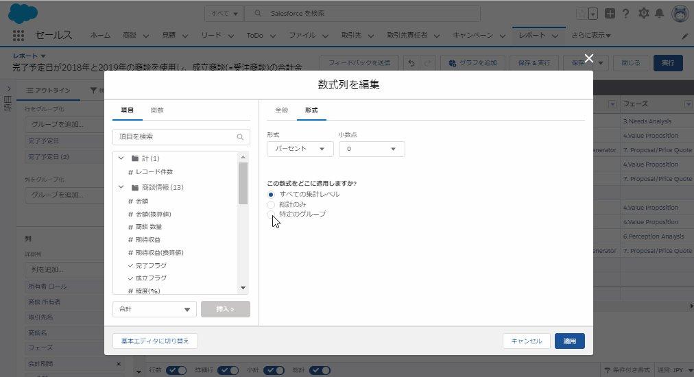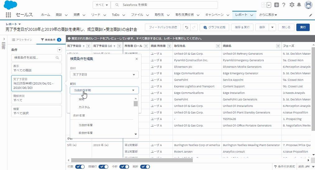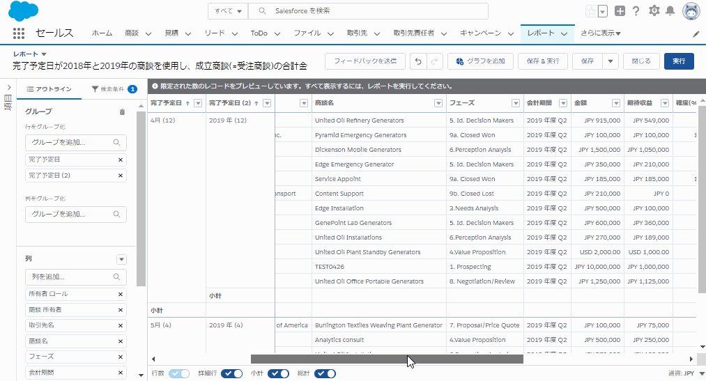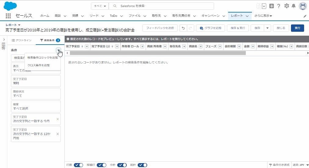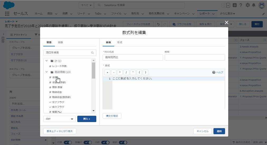 完了予定日が2018年と2019年の商談を使用し、成立商談(=受注商談)の合計金額の前年同月比を算出する