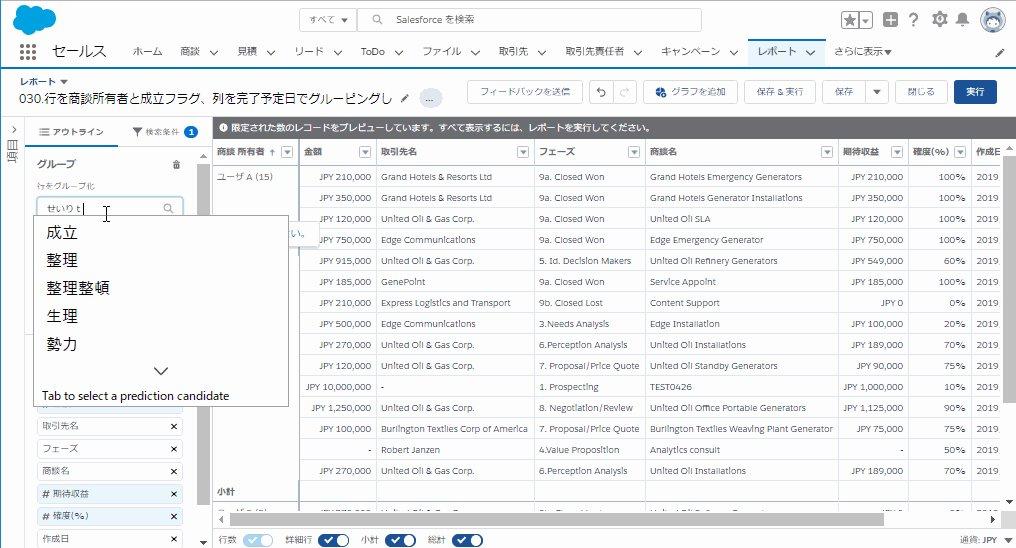 4.[行をグループ化]|[グループを追加]にて[商談 所有者]でグルーピングします