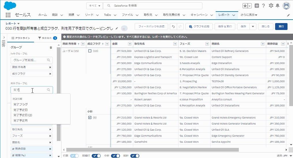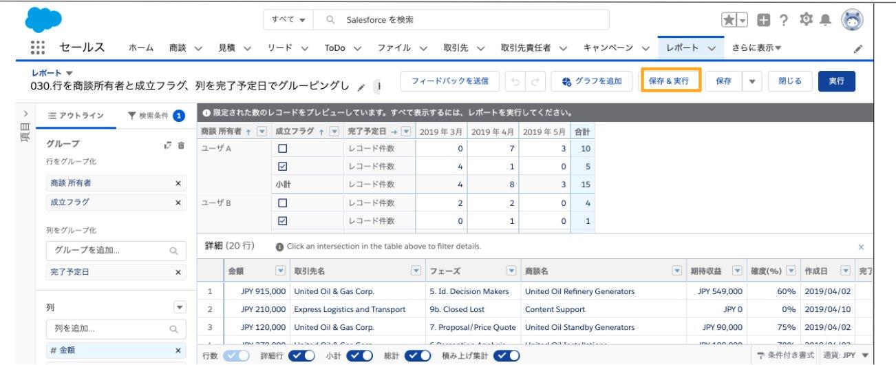 行を商談所有者と成立フラグ、列を完了予定日でグルーピングして商談件数を集計する