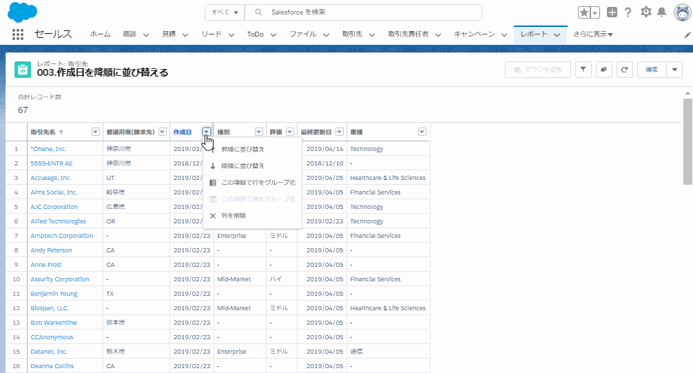 4.[作成日]項目の値を基に降順に並び替えをします