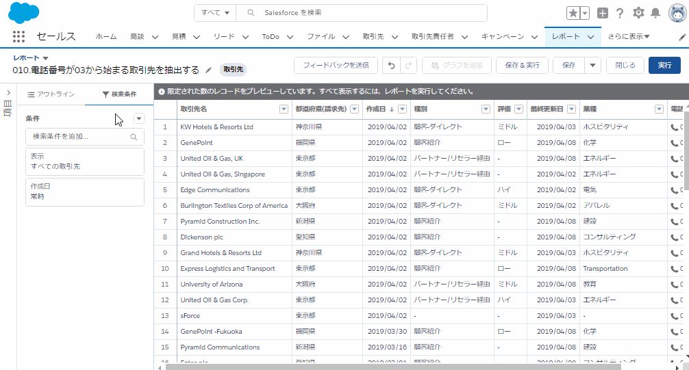 [検索条件]にて、[検索条件を追加]にて「電話」と入力し、選択します