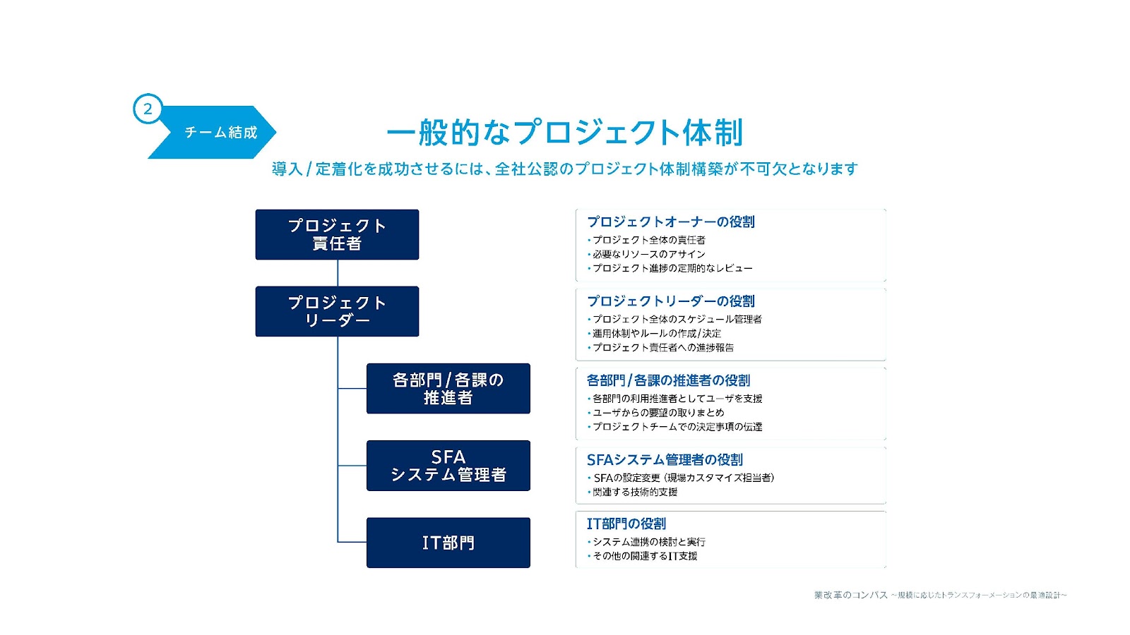 その後、多くの企業では経営企画部や営業推進部からプロジェクト・リーダーやメンバーが選出され、プロジェクト・チームが作られます。メンバーは専任で選ばれる場合もあれば、兼任の場合もあります。理想的なのはメンバーがプロジェクトに専念できる形ですが、コアメンバーでない限り、兼任メンバーとして各部門長やリーダーが集まり、営業改革の具体的な方向性を議論し、現場浸透を推進する役割を担うことが多いのが実態です。