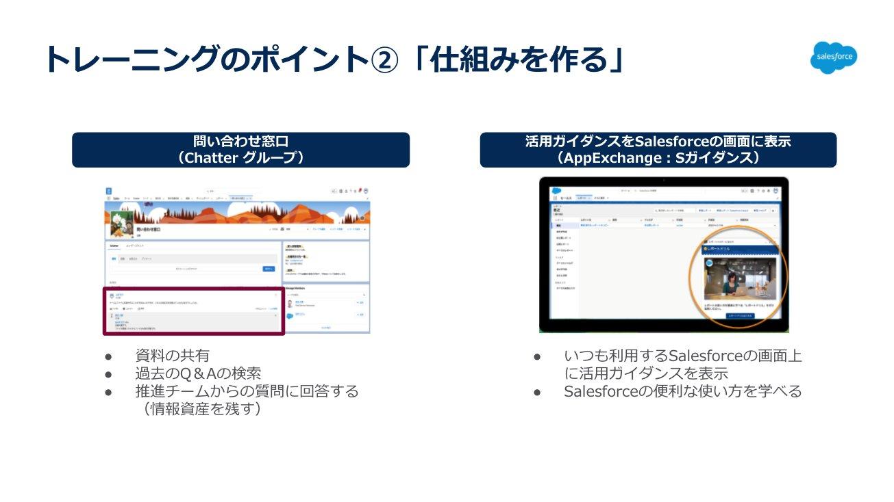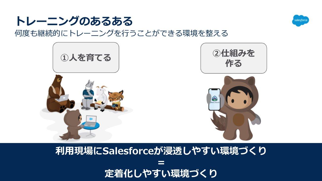 この2つのポイントを実施することで、Salesforceが浸透しやすい環境がつくられ、定着化しやすい環境へ変化します。