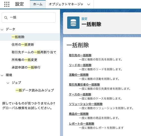 - [一括削除]画面に表示されていないオブジェクトのデータを削除する場合は、データローダを利用します。