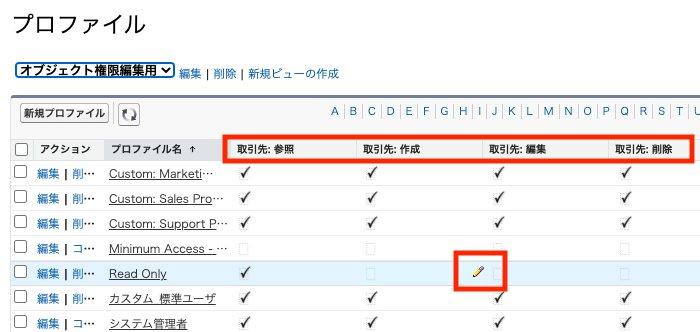 以下は、プロファイル毎に、取引先のオブジェクト権限の設定を表示するリストビューのサンプルです。