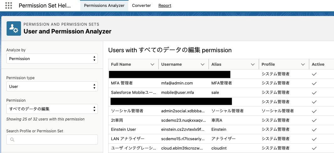 また、「特定の権限が付与されているユーザは誰か?」というように権限を条件にユーザやプロファイル、権限セットを検索したい場面もあるかと思います。そんな時には、AppExchangeサイトで公開されている「Permission Helper」アプリケーションをぜひご活用ください。
