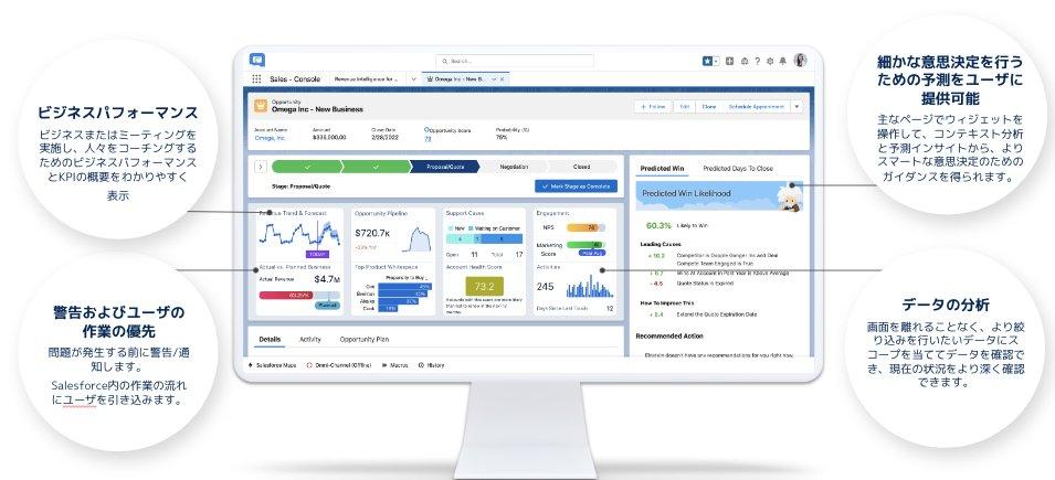 Salesforceと直接連携し、現状や過去の経緯をもとにした分析だけでなく、将来の結果を予測し、ビジネスにおいて次の行動を考える手助けをします。