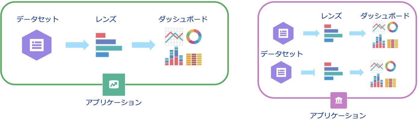 データセット、レンズ、ダッシュボードのグルー プを含む動的な「フォルダ」のことで、同僚との共有が可能(アプリケーションごとに共有範囲の 設定が可能)